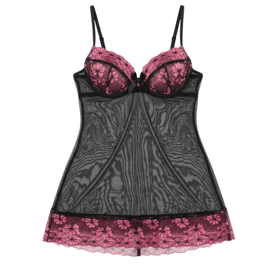 Afterglow Black & Pink Lace Mini Dress – Underwire Support