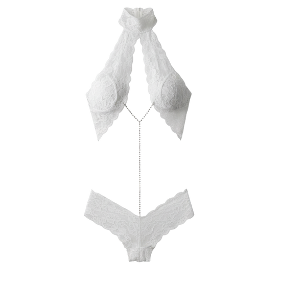 White halter lace bodysuit with rhinestone details for a radiant, modern glow.