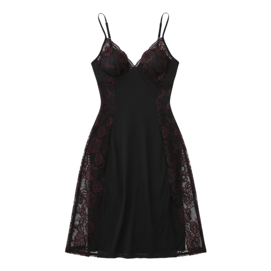 Two-tone red-and-black long lace gown paired with thong — an ode to midnight allure.