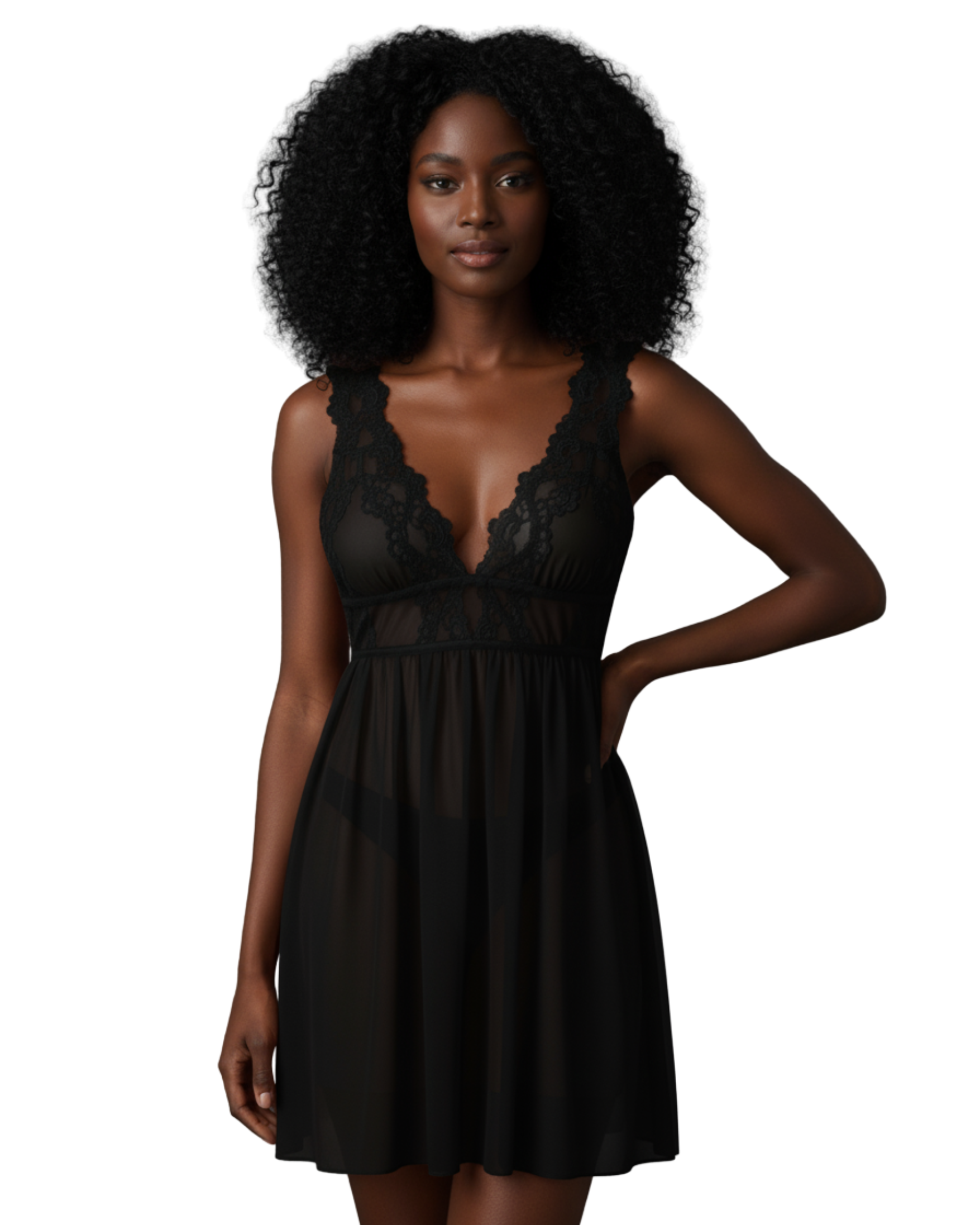 A sheer black mesh nightdress from the Midnight Whisper collection. Soft transparency and wide straps trace the silhouette with quiet confidence and sensual poise.