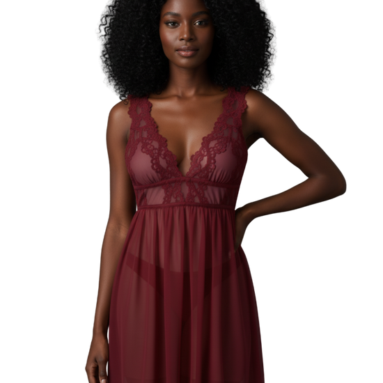 Deep wine-red mesh nightdress that whispers passion under moonlight — delicate, fluid, and endlessly elegant.