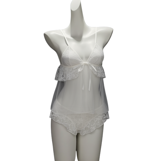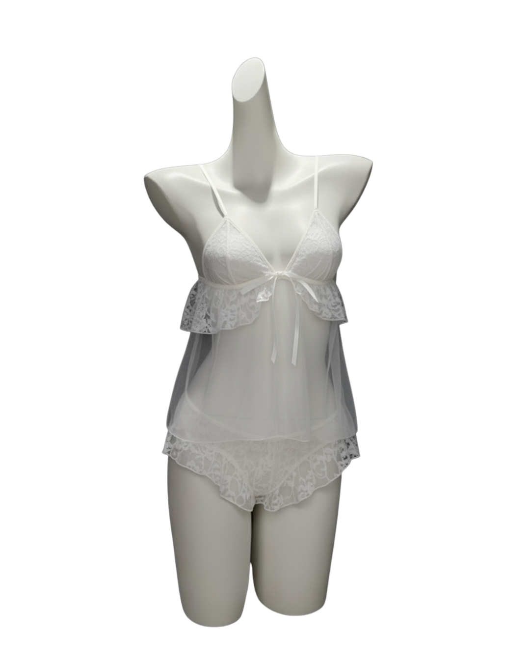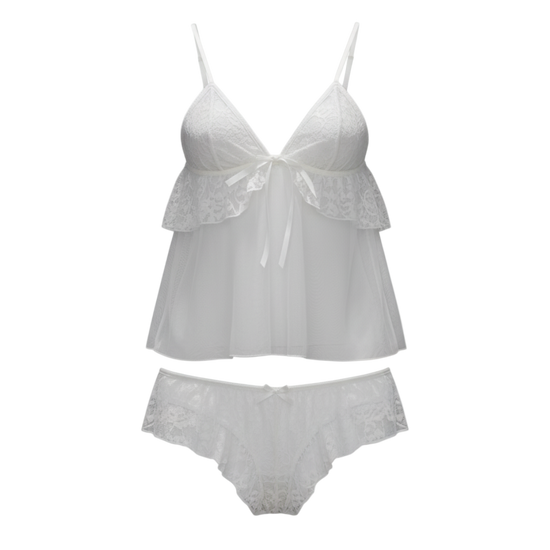 Elegant white lace camisole for an angelic glow; soft transparency creates a subtle sculpted contour.