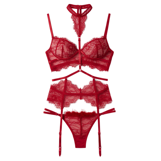 A luxurious corset set in scarlet lace, paired with matching stockings — timeless shape and radiant femininity.