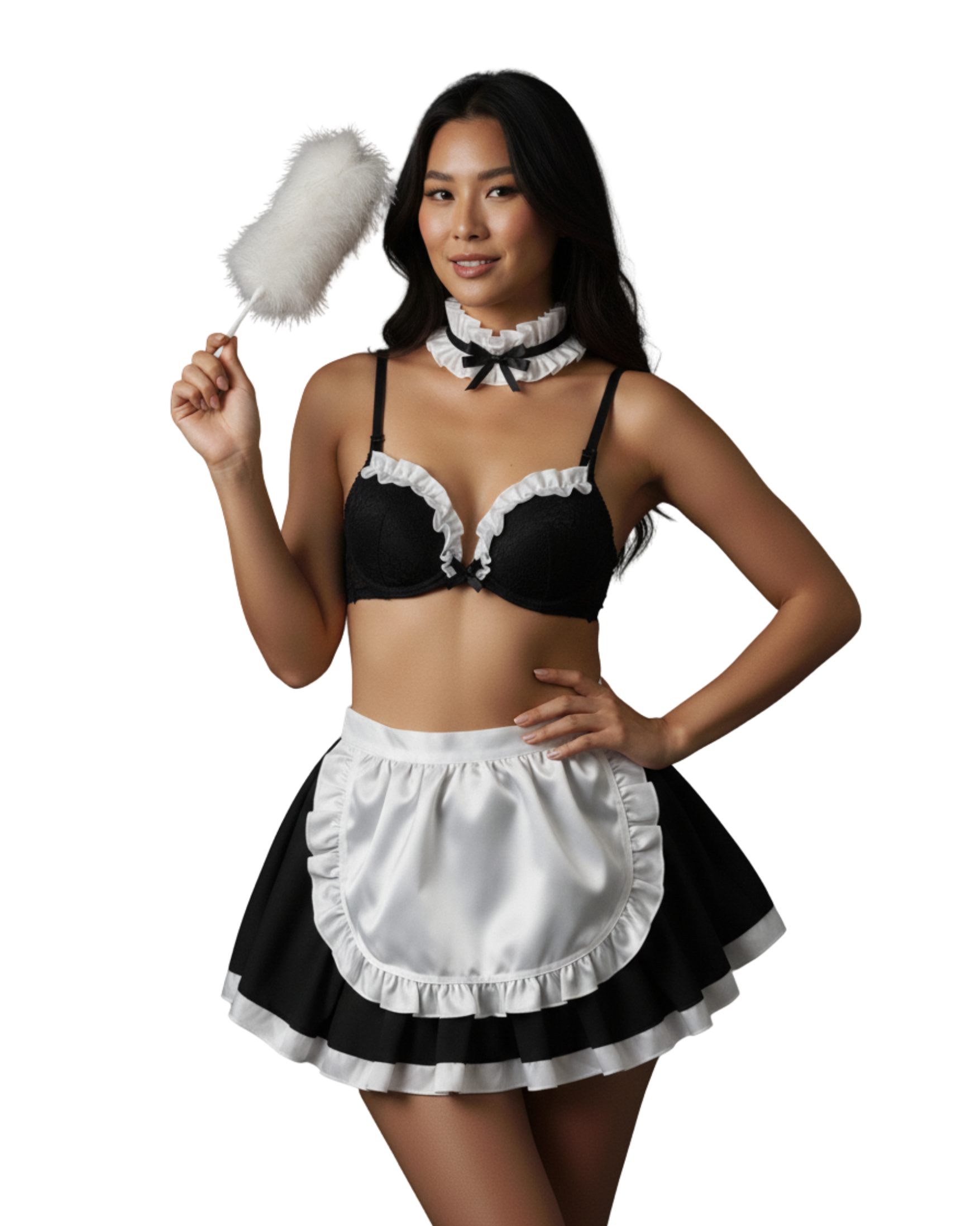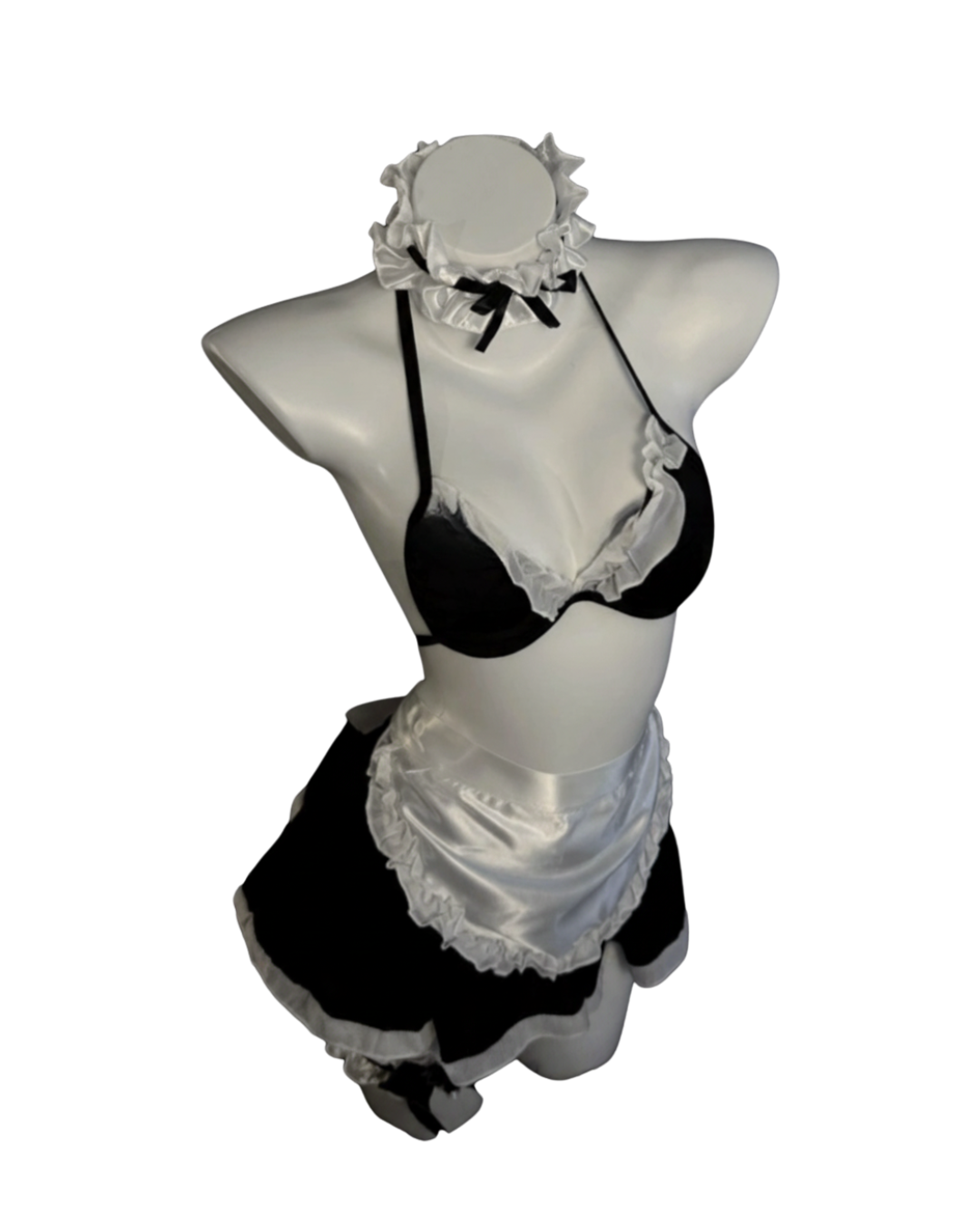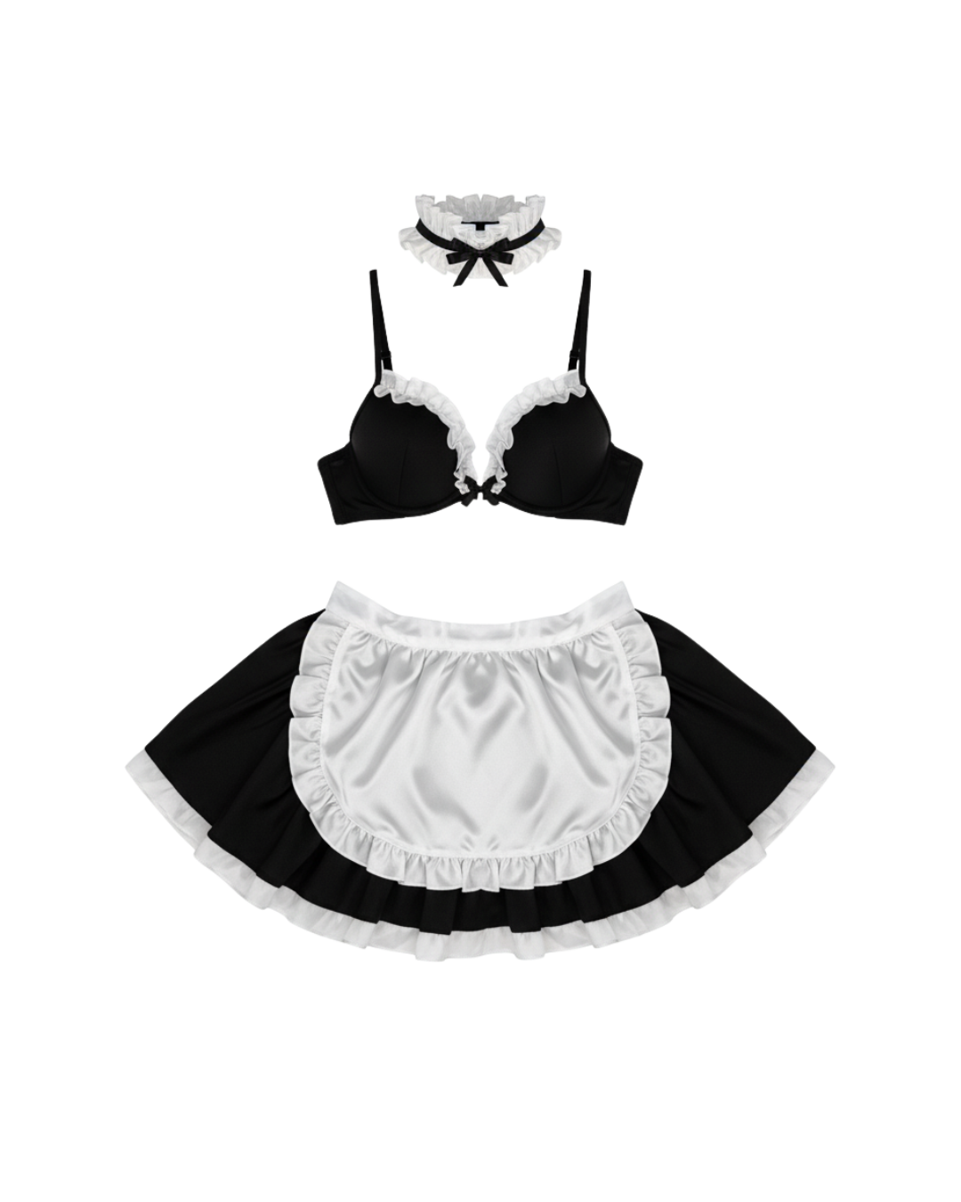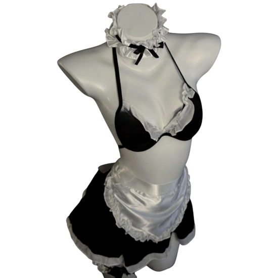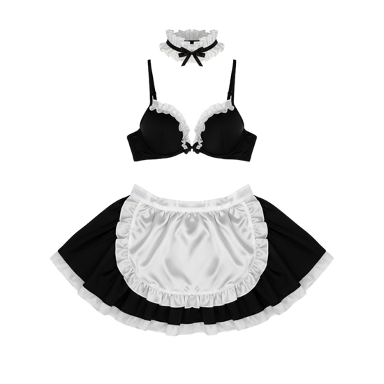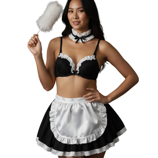 A refined maid-style lingerie set with ruffle details and polished charm — classic roleplay elegance.