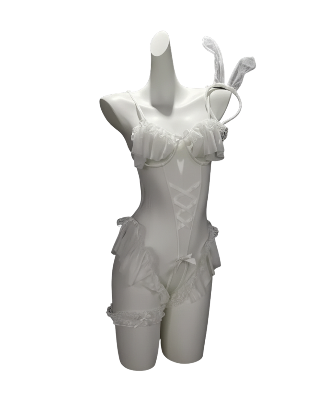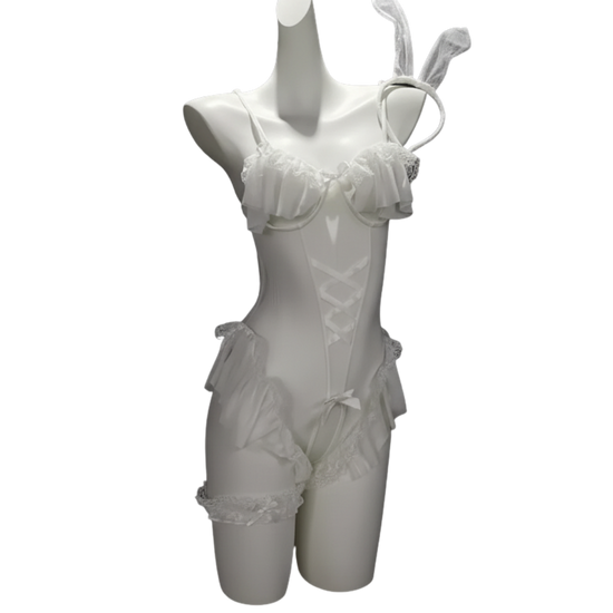 Clean white mesh bodysuit featuring playful ear accessories and refined detailing — pure charm redefined.
