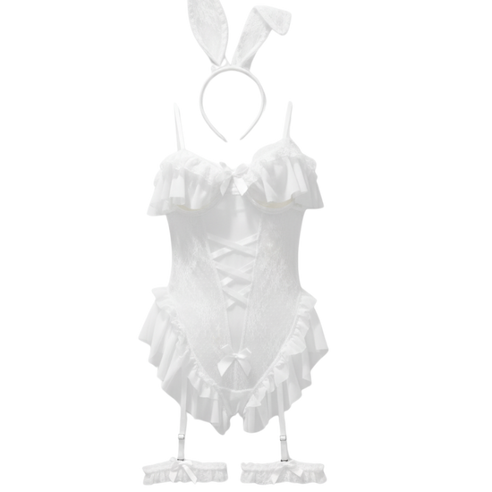 Velvet Bunny Mesh Bodysuit Set – White