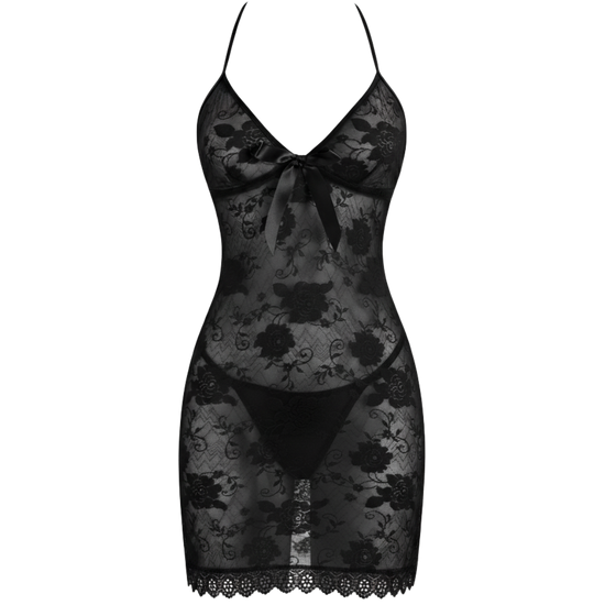 Black lace slip dress with fine transparency and sleek, timeless cut.