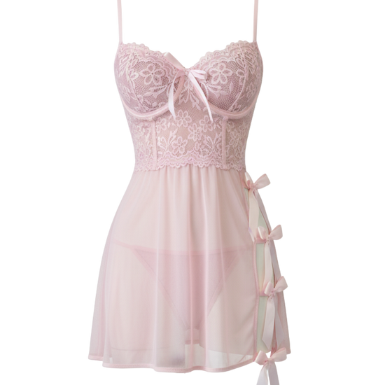 Soft pink mesh mini dress with a subtle bow accent for gentle charm.