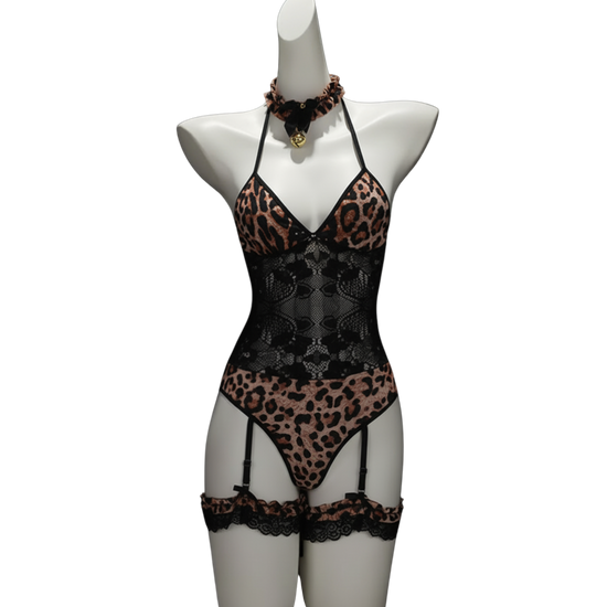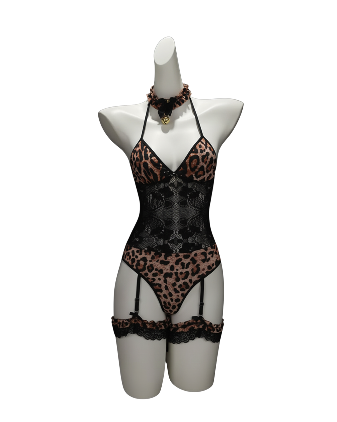 Leopard-pattern halter bodysuit with sheer panels and flexible fit — designed for statement evenings and untamed grace.